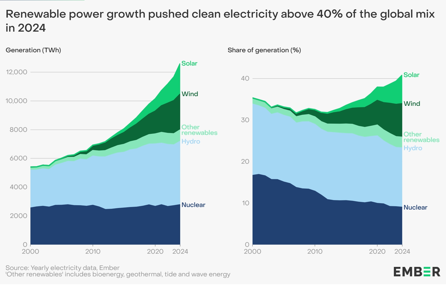 Potrivit Ember, anul 2024 a fost cel mai important de până acum în tranziția energetică: sursele cu emisii reduse (regenerabile + nuclear) au produs 40,9% din electricitatea globală. Acesta este cel mai ridicat procent din ultimii 80 de ani. În comparație, în 2023 procentul a fost de 39,4%.